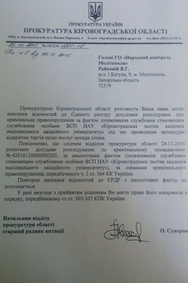 Нардеп Сергей Лещенко, к которому мелитопольские общественники обратились со всеми вышеперечисленными жалобами и подозрениями в коррупционных деяниях членов семьи Евгения Балицкого и руководства Кировоградской летной школы, передал письма в правоохранительные органы. И как стало известно одному из мелитопольских сайтов, Кировоградская прокуратура уже возбудила уголовное дело и внесла в Единый реестр досудебных расследований сведения об уголовном правонарушении по факту злоупотребления служебным положением должностных лиц «Кировоградской летной академии авиационного университета» во время проведения открытых торгов по покупке услуг аренды самолета.