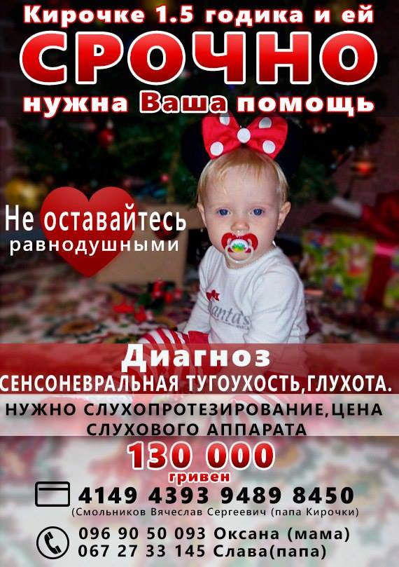Но цена слухового аппарата 130 000 грн. (2 шт), самостоятельно этой суммы родственникам не собрать.