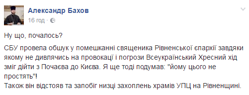 "Ну что, началось? СБУ провела обыск в доме священника Ривненской епархии благодаря которому, несмотря на провокации и угрозы, Всеукраинский Крестный ход смог дойти из Почаева в Киев. Я еще тогда подумал: "Ему этого не простят!"", - написал он.