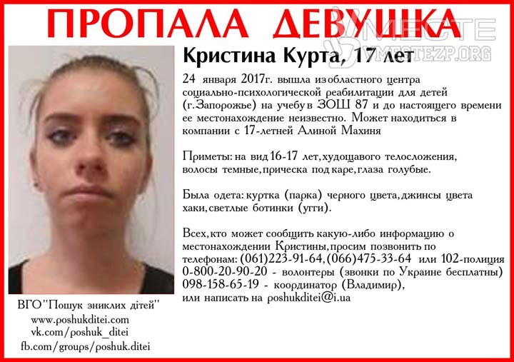 24 января в Запорожье пропала 17-летняя Кристина Курта. Девочка вышла из центра социально-психологической реабилитации для детей в Запорожье и больше её никто не видел.