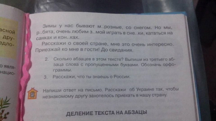 В учебниках опубликовано послание школьников из России. В тексте учеников страны-агрессора называют «друзьями» для школьников Украины и рассказывают о «прекрасной и красивой» России.