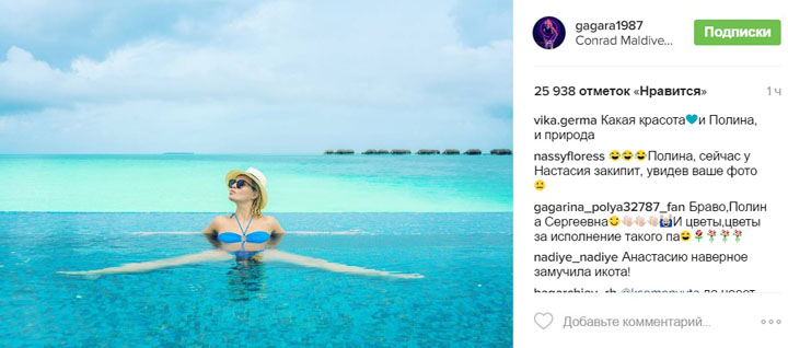 Популярная российская певица Полина Гагарина, которая до сих пор не подтвердила и не опровергла слухи о своей второй беременности, во время отдыха на Мальдивах попыталась повторить знаменитый шпагат балерины Анастасии Волочковой.