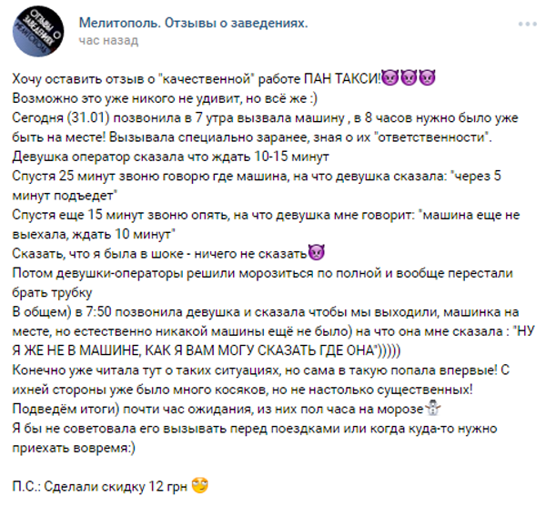 Но на деле оказывается по-другому. Своей историей в соцсети поделилась жительница Мелитополя. Вызвав такси заранее, девушка рассчитывала попасть в нужное ей место в определенное время. Не тут-то было. Длительное ожидание на морозе, множество звонков диспетчеру и как итог - опоздание, в утешение за которое клиентке предоставили скидку целых 12 гривен.