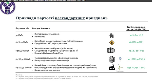 НКРЭКУ любезно предоставила расчет средней стоимости присоединения для небытовых потребителей. Так вот, за небольшой многоквартирный дом нужно будет заплатить от 335 тыс грн до 1 млн грн, за жилой комплекс или торгово-развлекательный центр – от 1 до 6,7 млн грн и так далее.