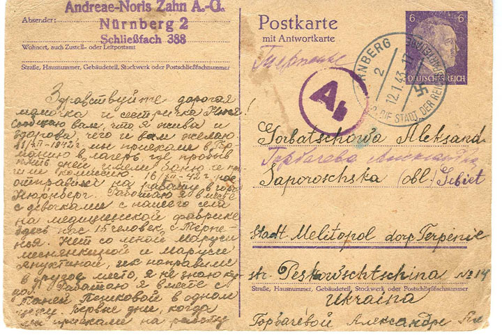 Этим терпеньевским девушкам повезло: они трудились не в шахте, а на фабрике – паковали медикаменты. Жили в полуподвальном помещении, спали на железных кроватях в два яруса на матрасах и подушках, набитых соломой. Читая открытки сегодня, мы можем удивляться описаниям жизни сытой и довольной, рассказам о цветущей Германии. Но родные понимали: верить не стоит. «Мы договорились с родителями: если я в письме буду что-то расхваливать, значит, все наоборот, - вспоминает сегодня одна из угнанных, Татьяна Певзикова.