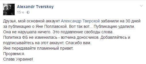 Впоследствии Поплавская удалила свой пост, а аккаунт Тверского был забанен, а его ответ актрисе был также удален.