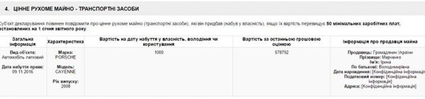На рынке стоимость авто в среднем составляет 578 792 гривен, заместитель же главы облсовета купил авто за 1000 гривен у матери.