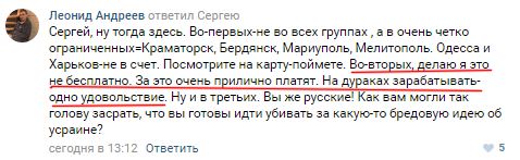 Однако, архангельский троль продолжил гнуть свою линию, превращая интернет-площадку в поле своей пропагандисткой деятельности. В процессе он признался, что написание постов такого содержания - его работа, за которую хорошо платят, а на дураках, которыми он, видимо, считает украинцев, зарабатывать приятно.