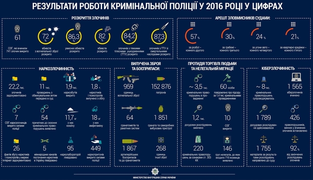 Соответствующую инфографику успехов Криминальной полиции опубликовал глава департамента коммуникаций МВД Украины Артем Шевченко на своей странице в Facebook.