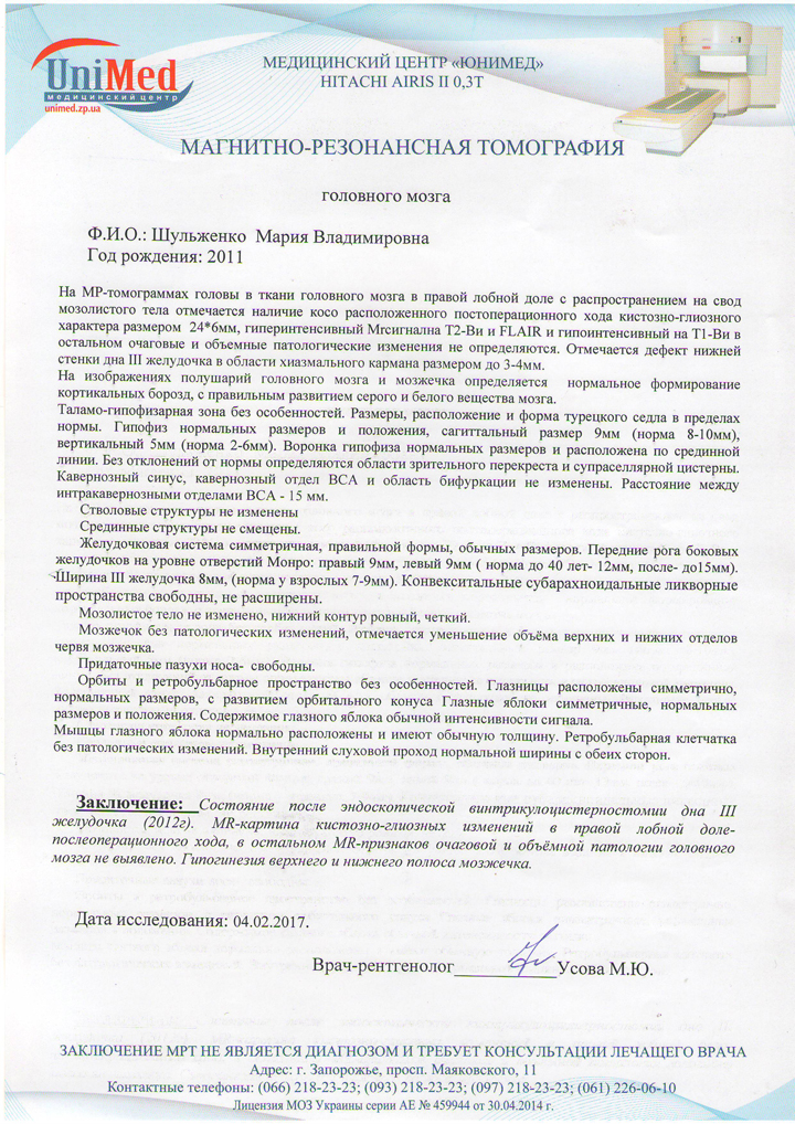 5-летней Машеньке Шульженко очень нужна медицинская помощь, у нее после операции по устранению гидроцефалии образовался рубец внутри черепной коробки, который начал преобразовываться в кисту, сейчас его размеры 24 на 6 мм. Операция была проведена в сентябре 2016 года, и тогда читатели «МВ» оказали большую помощь, передав маме девочки 5200 грн. Сейчас при помощи медикаментов есть возможность устранить и эту кисту, но сначала ее нужно дополнительно обследовать в Запорожье.