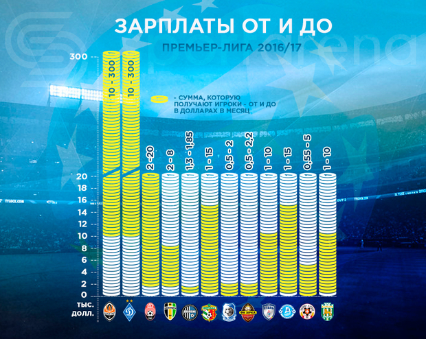 Сумма месячных выплат в киевской и донецкой командах колеблется от 10 000 до 300 000 долларов. На втором месте идут представители луганской "Зари" с окладом в 2 000 - 20 000 долларов в месяц.