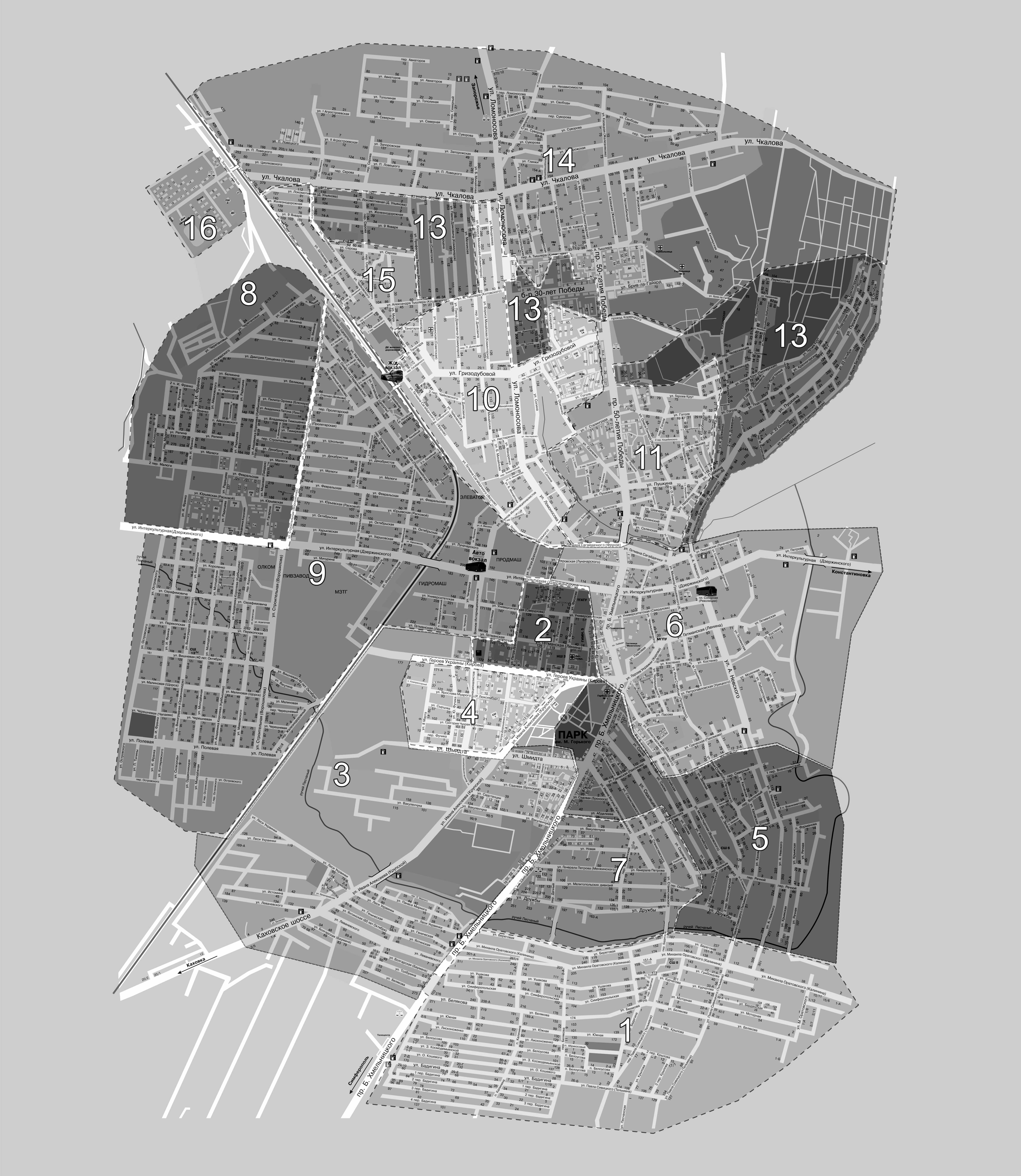 -Улицы: Интеркультурная (192-214, 232-382; 199-287, 291-351), А. Чигрина (88-152; 131-231), Университетская, Гетманская (118-222), Покровская (142-152), А. Фесюка (14-26, 15-29), Вишневая, Строительная (1-71, 77-101; 2-270), И. Франко (с 94-170 и до конца, с 53 и до конца), Короленко, Академика Королева (с 135 до конца, с 186 до конца), Маяковского (1-23), Молодежная, Островского, Виноградная, Перекопская (1-89; 2-78), Серафимовича, Ватутина, Черешневая, Малиновая, Г. Сковороды, Зиндельса, Индустриальная, Линейная (2-194, 200-232), Медовая, Мичурина, Амет-Хана Султана, Юрьевская, Харьковская, Февральская (1-209, 2-198), Декабристов (1-11; 2-128), Линейная (196-204), Малюги (1-147; 2-164), Школьная, Степная, Скифская, Ногайская, В. Тимошенко (1-89; 2-86).