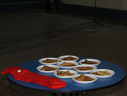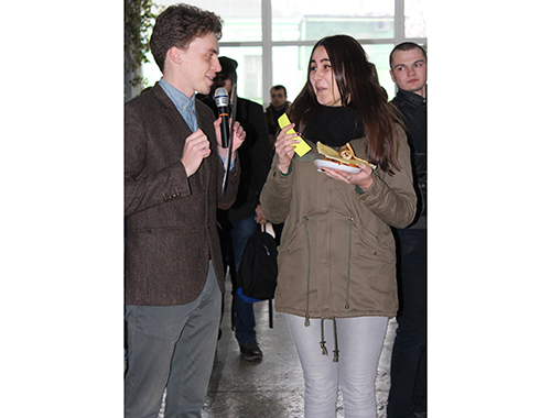 Но у веселых студентов праздник не мог обойтись одним лишь поеданием сладостей, поэтому было проведено пару "блинных" конкурсов. Сначала девчонки бегали от факультета к факультету, от стола к столу с целью набрать на свою тарелку как можно больше блинчиков. После них трое парней на скорость поедали блины без помощи рук. Победители обоих конкурсов получили в подарок по билету на университетскую игру КВН за Кубок Ректора, которая состоится 1 марта.