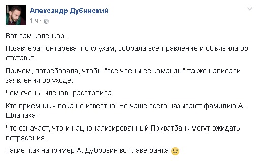 "Позавчера Гонтарева, по слухам, собрала все правление и объявила об отставке. Причем, потребовала, чтобы "все члены её команды" также написали заявления об уходе. Чем очень "членов" расстроила. Кто приемник - пока не известно. Но чаще всего называют фамилию А. Шлапака. Что означает, что и национализированный Приватбанк могут ожидать потрясения. Такие, как например А. Дубровин во главе банка", - написал Дубинский.