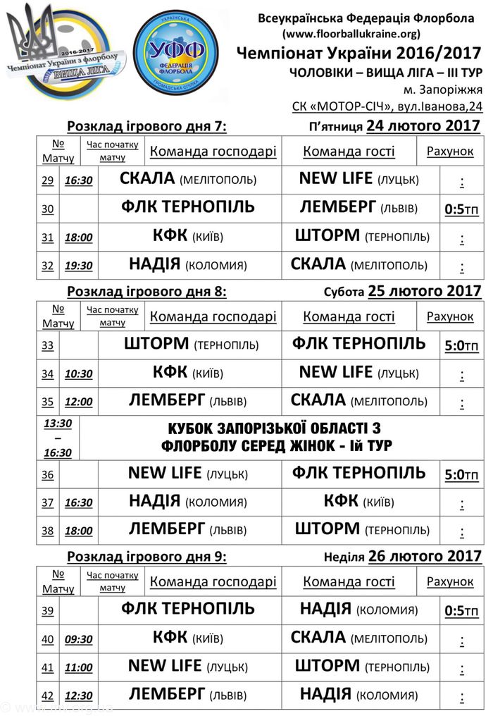 Любителей флорбола Мелитополя приглашают поддержать нашего флорбольного лидера - шестикратного и действующего чемпиона Украины команду "Скала" на матчах третьего тура регулярного чемпионата Украины среди мужских команд Высшей лиги, которые состоятся 24-26 февраля в Запорожье, на площадке СК "Мотор-Сич" по адресу ул. Иванова, 24.