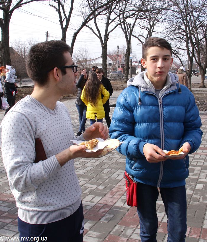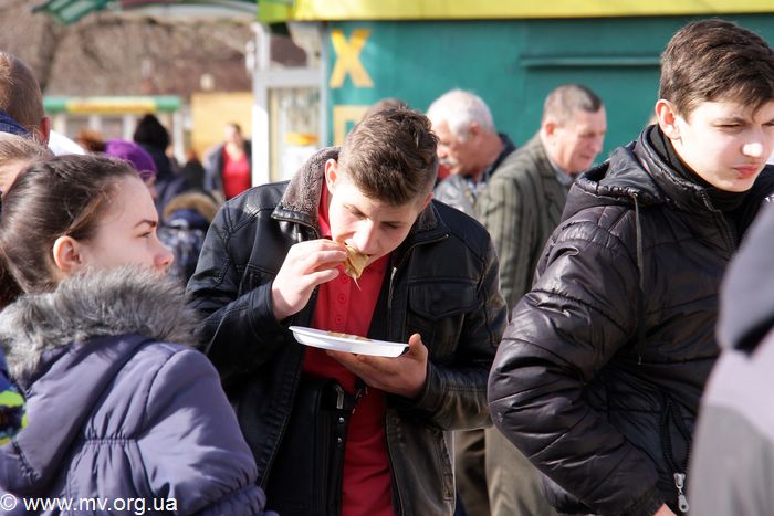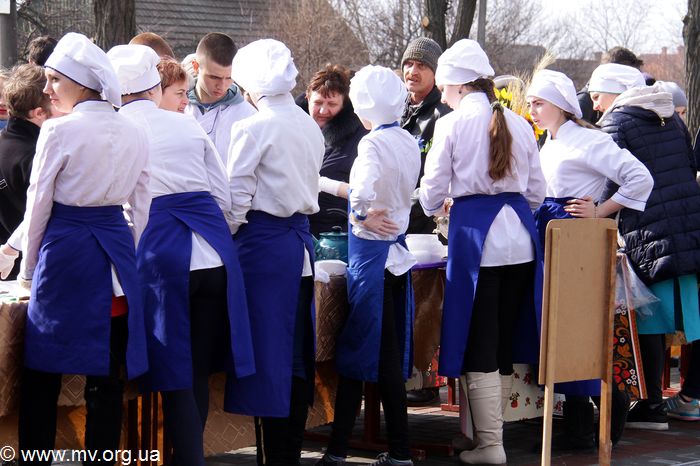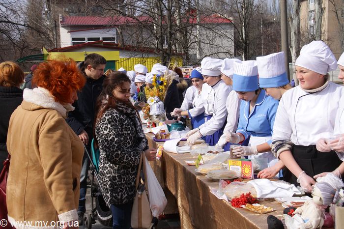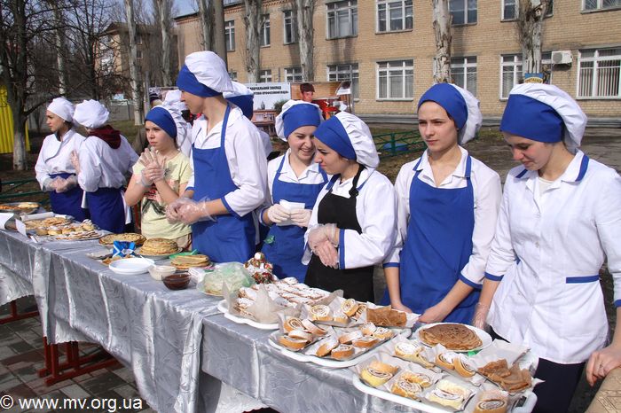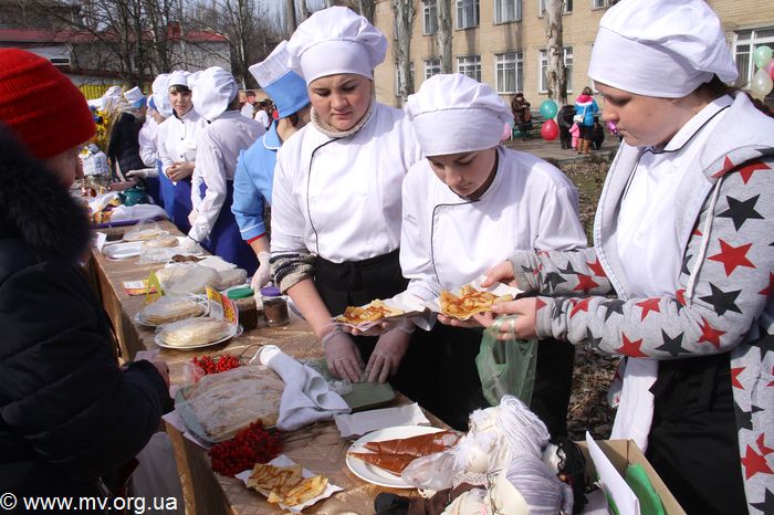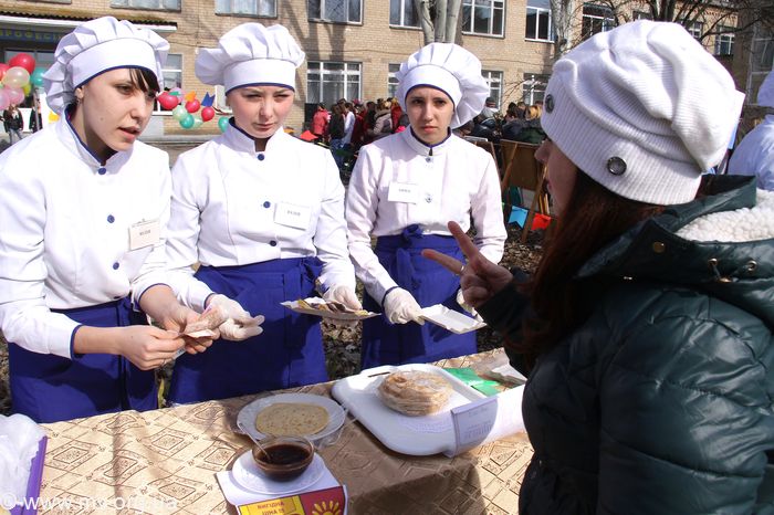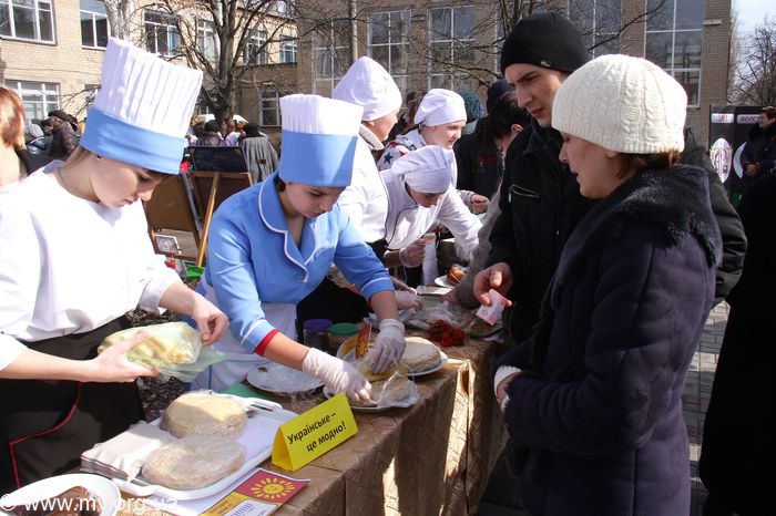 Ровно в полдень на площадке перед 37-м училищем (Торгово-профессиональным лицеем) раскинулась ярмарка-продажа блинов, выпечки и изделий, которые своими руками сделали учащиеся этих учебных заведений. Блинчики с пылу-жару продавались по довольно некусачей цене в 2-3 грн. По выбору покупателей им предлагалась начинка на любой вкус: творожная, со сгущенкой, вареньем, повидлом, шоколадом и даже с колбасой.