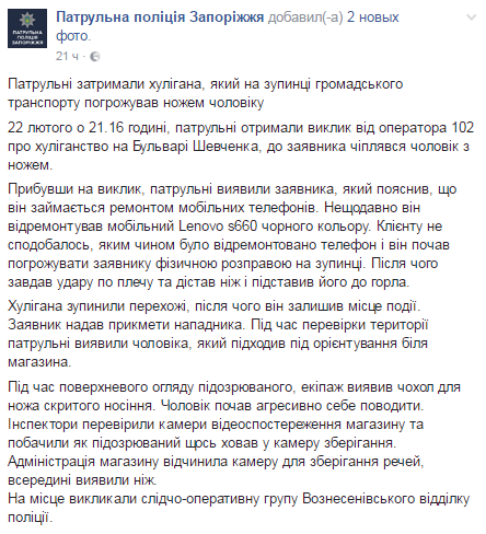 В среду, 23 февраля, в полицию позвонил мужчина, который занимается ремонтом мобильных телефонов и сообщил о человеке с ножом.