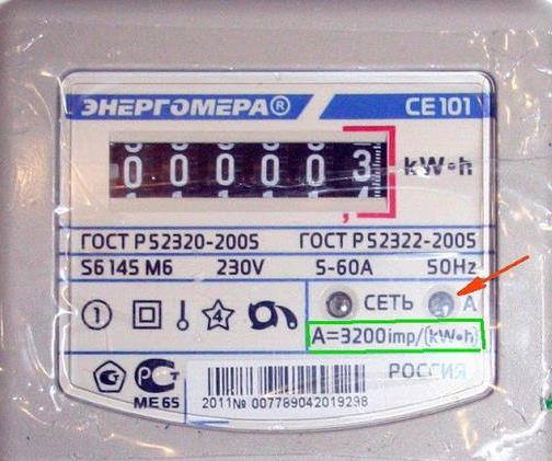 Они значат, что в данном конкретном домашнем счётчике один киловатт-час «набегает» ровно через каждые 3200 импульсов, отображаемых светодиодом «А», который отмечен на фото красной стрелкой (прошу заметить, что число «А» в разных счётчиках бывает очень разное). Именно эти электронные импульсы и подсчитываются механическими колёсами счётчика. Другими словами, каждый три тысячи двухсотый импульс знаменует собой один подсчитанный киловатт*час.