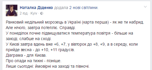 "Утренний воскресный морозец в Украине - как же ты надоел. Но ничего, завтра потеплеет. Действительно. В Киеве завтра днем уже +6, +7, во вторник до +8, +9, а в среду, когда придет весна +10, +11 градусов", - отметила синоптик.