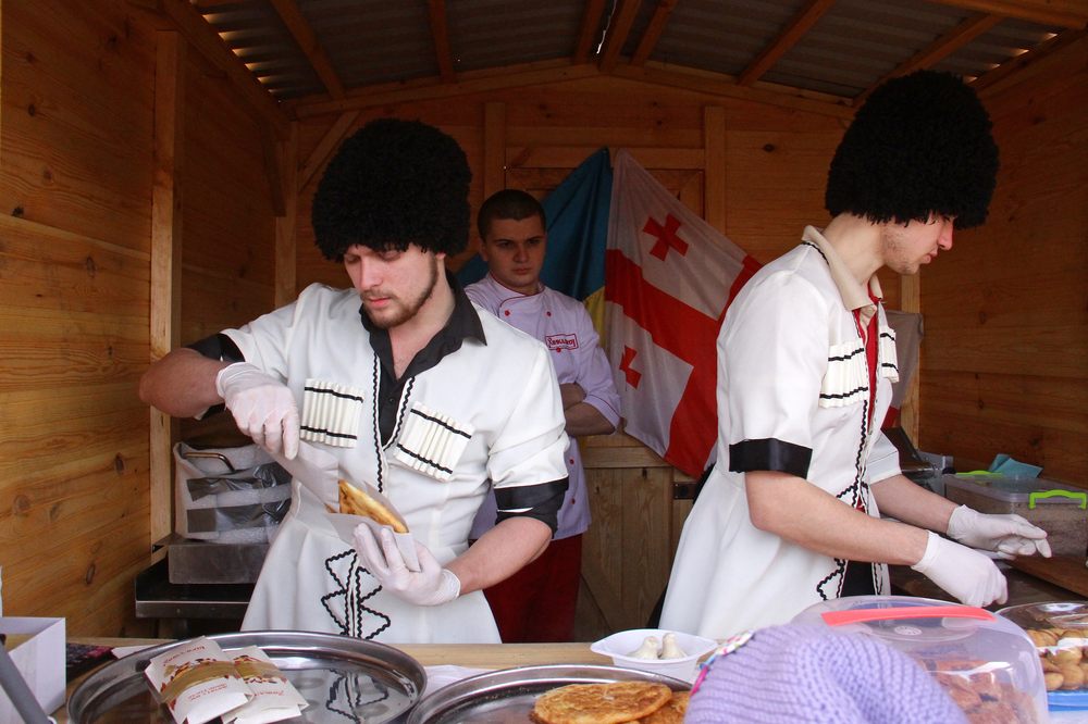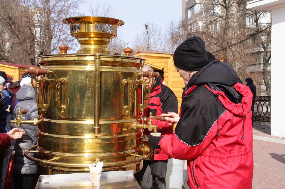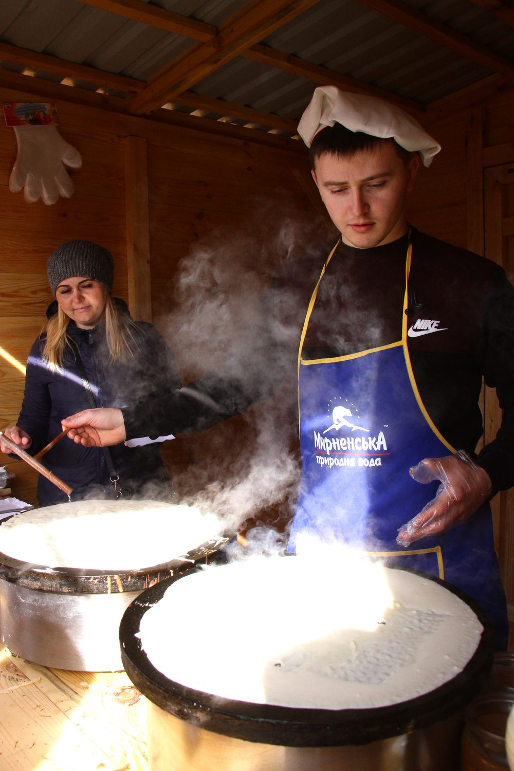 В десятке разнообразных торговых палаток можно купить фрукты, выпечку, расписные пряники, поделки мелитопольских мастеров, игрушки, шары, свистульки, вышиванки и многое другое. Но главными сегодня на празднике являются блины. В палатку за бесплатными блинами выстроилась огромная очередь. Это угощенье для горожан устроил депутат горсовета Роман Романов. Рядом с этой палаткой блестит на солнце, украшает собой ярмарку 200-литровый самовар от фирмы "Запорожский самовар", из которого наливают ароматный травяной чай. Можно добавить градуса и тепла в соседней палатке, где продают глинтвейн по цене 20 грн. за стаканчик. А кто не хочет стоять в очереди, может купить себе блинчики по цене от 18 до 20 грн. - цена зависит от начинки.