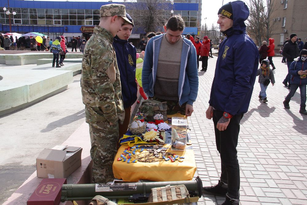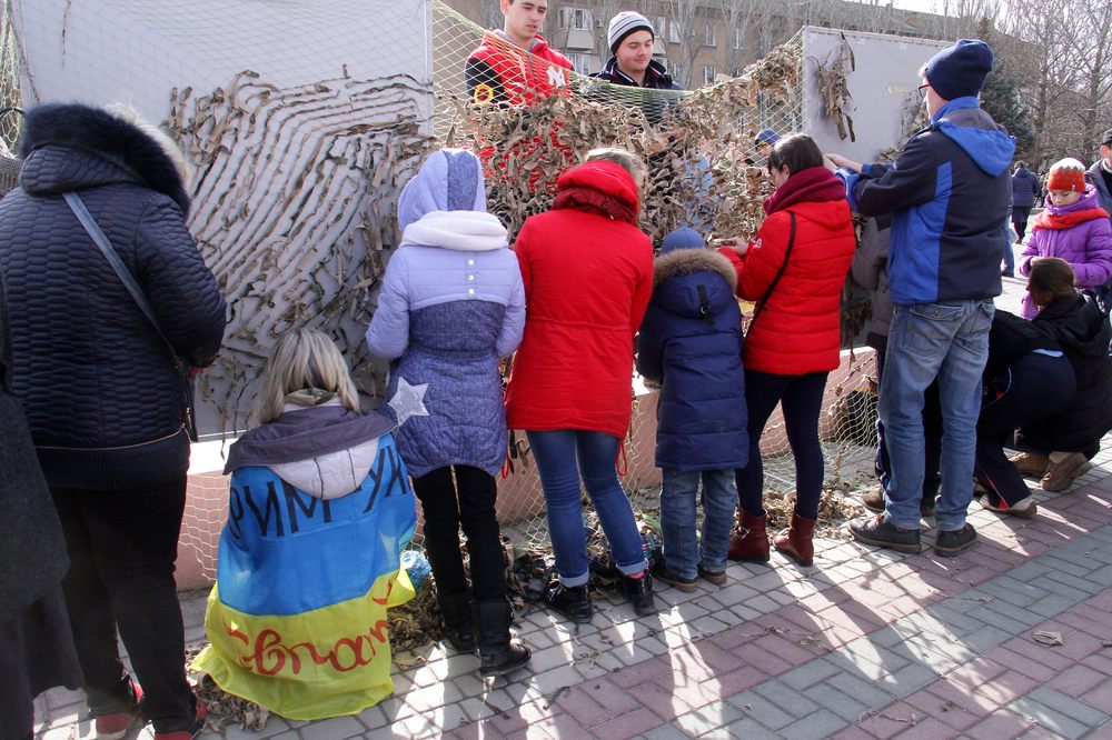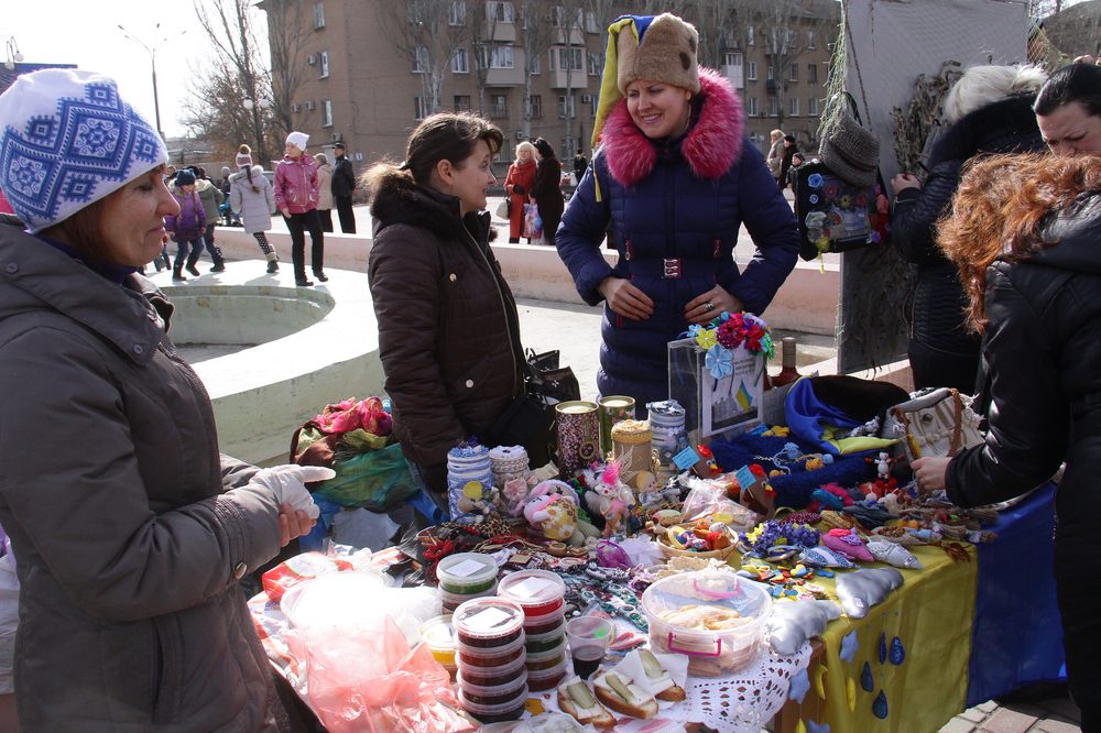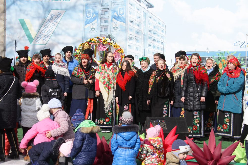Возле ДК им. Т. Шевченко на сцене народ развлекают песнями и танцами, играми и соревнованиями между командами "блинчиков" и "вареничков". Любители фото порадуются большому количеству разнообразнейших фотозон, устроенных организаторами. У входа в ДК народный театр кукол "Алые паруса" готовится к кукольному представлению. Ближе к фонтану волонтеры предлагают купить фенечки, брелоки, значки и помочь своей гривной военнослужащим. Нет денег - можно внести свой вклад в плетение маскировочных сетей.