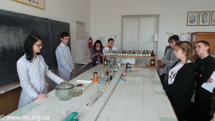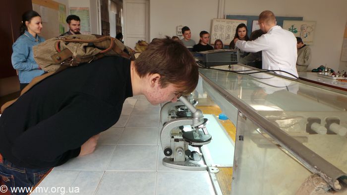 Тем временем другая группа выпускников школ работает под руководством студентов и преподавателей кафедры ботаники и садово-паркового хозяйства. В лаборатории проводится физиологический опыт флуорисценции хлорофилла. А после ребята-школьники с нетерпением всматриваются в окуляры микроскопов.