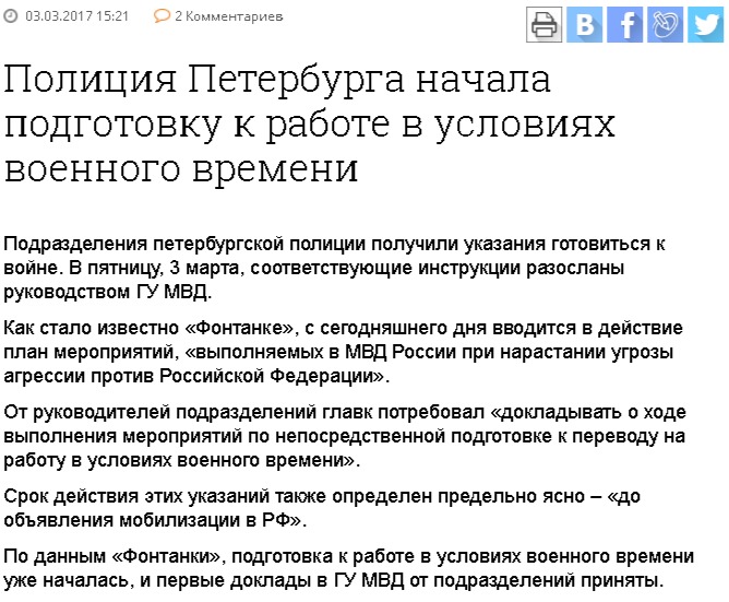 Авторитетное питерское интернет-издание Фонтанка сначала опубликовало, а позже без объяснения причин удалило с сайта заметку о том, что питерская полиция начала подготовку к работе в условиях военного времени.