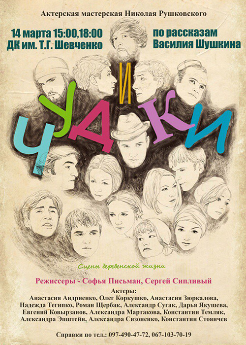 А в 15.00 и 18.00 на сцене ДК им. Т. Шевченко, артисты этого театра покажут спектакль-анекдот, спектакль-исповедь "Чудики" по рассказам Василия Шукшина. Умный и правдивый, пестрый, смешной и глубоко драматический спектакль о простодушных людях, чья детская непосредственность, бескорыстие, умение радоваться жизни вопреки всем невзгодам, покоряет ошеломленного зрителя. В спектакле заняты молодые популярные украинские актеры, известные мелитопольскому зрителю по фильмам "Аврора", "Женская интуиция", "По законам военного времени", "Не зарекайся", "Ты все равно будешь моей", "Моя бабуся Фані Каплан" и др.