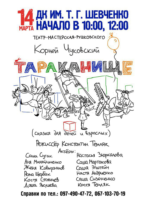 По информации ДК им. Т. Шевченко, 14 марта в 10.00 и 12.00 артисты Киевского театра-мастерской Н. Рушковского, в составе которого наши земляки - Александра Мартакова и Константин Стоянчев, представят на сцене ДК им. Т. Шевченко "Сказку для детей и взрослых" по произведению Корнея Чуковского "Тараканище".