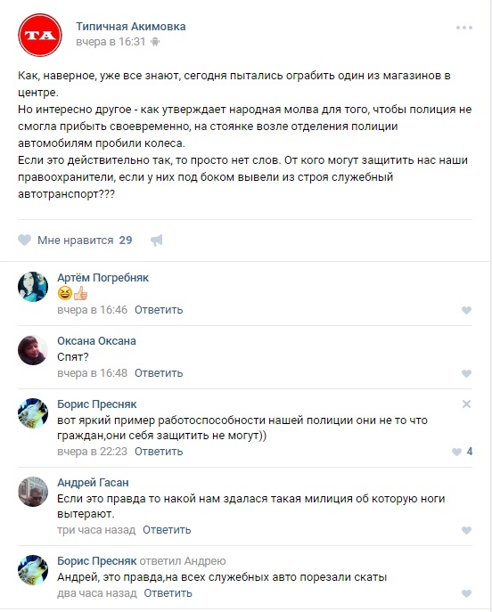По словам местных жителей, чтобы полиция не смогла прибыть своевременно на всех служебных авто возле отделения порезали шины.