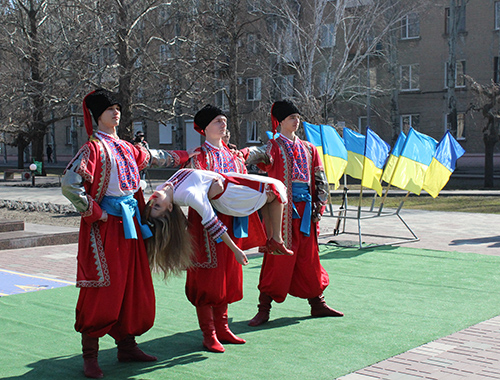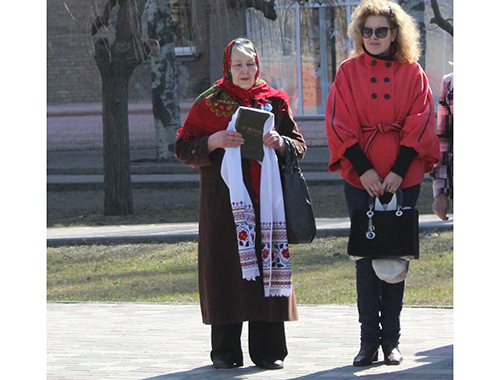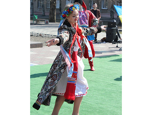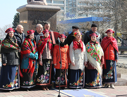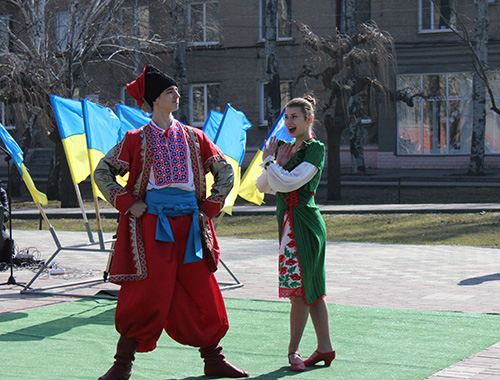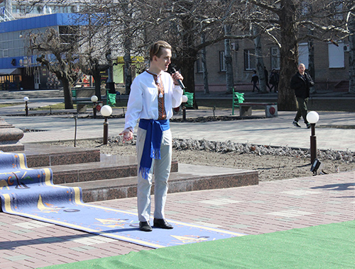 В полдень на площади вспоминали биографию поэта и его творческое наследие. И первыми инсценировку на произведение Тараса Григорьевича "Катерина" показали студенты Мелитопольского училища культуры. Несколько песенных композиций на слова поэта, в том числе и широко известный "Реве та стогне Дніпр широкий", исполнил ансамбль бандуристов "Джерела".