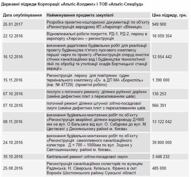 Корпорация "Альтис-Холдинг" и ООО "Альтис-Спецбуд", которые принадлежат Александру Глимбовскому, тестю отстраненного от должности главы ГФС Романа Насирова, с 2010 года выиграли государственные тендеры на сумму 3,39 миллиардов гривен.