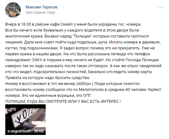 Молодой человек оставивший свой автомобиль у кафе "Смайл", обнаружил пропажу номеров и вызвал полицию. Стражи порядка протокол составили, но в качестве оперативных мер предложили мужчине... самому поискать украденное. Своим возмущением молодой человек поделился в соцсети:
