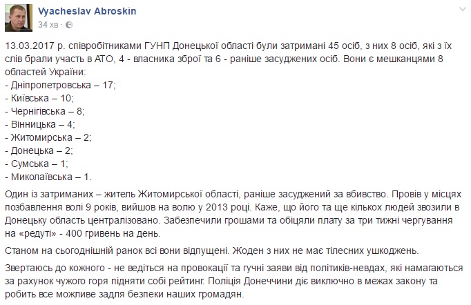 Шиман также отметила, что из 43 задержанных пятеро – ранее судимы. Десять человек сообщили, что принимали участие в АТО.