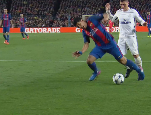 Суарес упал в штрафной зоне после минимального контакта с Верратти, Айтекин отреагировал желтой карточкой уругвайцу за симуляцию. Претензия ПСЖ здесь не столько к рефери, сколько, видимо, к Суаресу, который, по их мнению, не прекратил после этого давить на арбитра падениями.