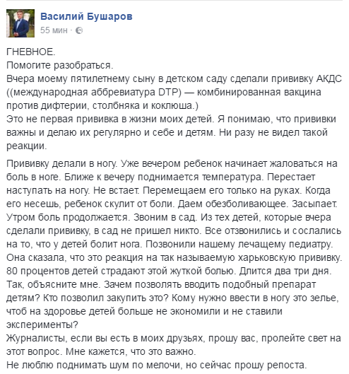 По словам Василия Бушарова, никто из детей, кому вчера сделали вакцину АКДС (против дифтерии, столбняка и коклюша) не пришел сегодня в садик, жалуясь на сильную боль в ноге (вакцина делается в верхнюю часть бедра).