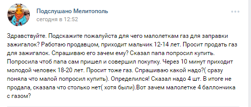 Сегодня в соцсети девушка-продавец задала вопрос - для чего подростки покупают и как используют газ в баллончиках, предназначенный для заправки зажигалок.