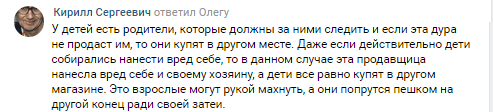 Неравнодушие взрослых иногда становится единственным барьером, отделяющим ребенка от смертельного шага. В данном случае позиция девушки, несомненно, заслуживает уважения. Потеря выручки, от которой, наверняка, зависит зарплата продавца, не заставила ее пойти против собственной совести. И, к счастью, нашлись люди, которые поддержали ее решение.