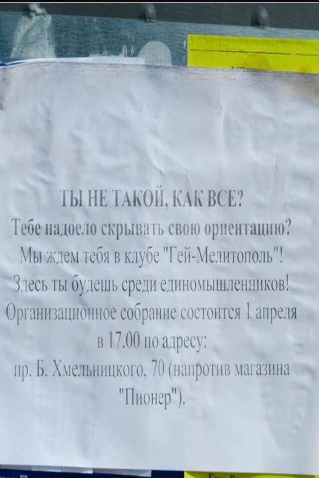 На белых листах офисной бумаги, формата А-4, распечатан текст, приглашающий людей с нетрадиционной ориентацией собраться 1 апреля, в 17.00 по адресу Б. Хмельницкого, 70, в в "клубе "Гей-Мелитополь".