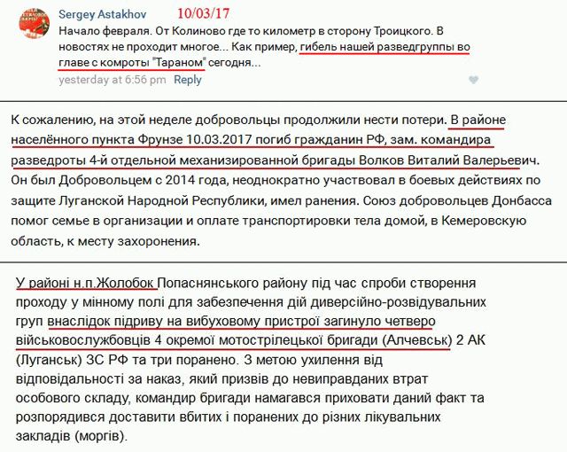 «Necro Mancer»: «Рашист Волков Виталий Валерьевич «Таран» (12/02/74, Березовский), погиб 10/03/17 в районе Желобка». Между прочим, гражданин РФ из Кемеровской области.