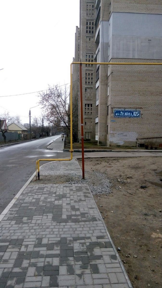 в статье не правильно поставлена проблема- эти трубы уже так стоят больше 5 лет. и то, что под трубой нет плитки, еще раз подтверждает, что газовые трубы были установлены раньше. Вопрос в другом: чем именно надо было руководстоваться, чтобы так положить тротуарную плитку. А таких "дизайнерских" провалов по этой улице масса.