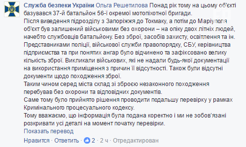 — Серед міста склад зі зброєю незаконного походження перебував без охорони та відповідних документів. Тому вважаємо, що інформація була подана коректно і ми не зобов’язані розкривати усі деталі на момент початку перевірки. — заявляют в СБУ.