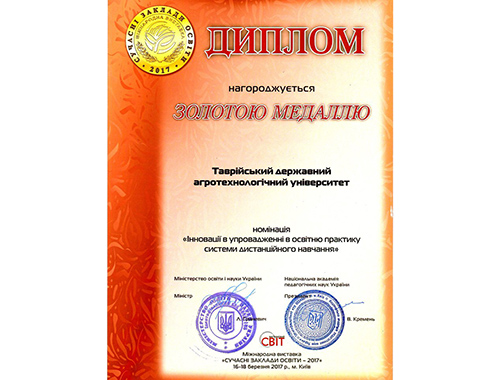 Вторая награда ТГАТУ на выставках в этом году - золотая медаль в номинации "Инновации во внедрении в образовательную практику системы дистанционного обучения". Это высокая оценка результативности учебной работы университета за последние годы. Во время конкурса поданные в 9 номинациях информационные материалы (там, где участвовал ТГАТУ, было 198 конкурсных работ из общего количества в 873 работы) обрабатывались экспертами Министерства образования и науки Украины и выбирались лучшие вузы.