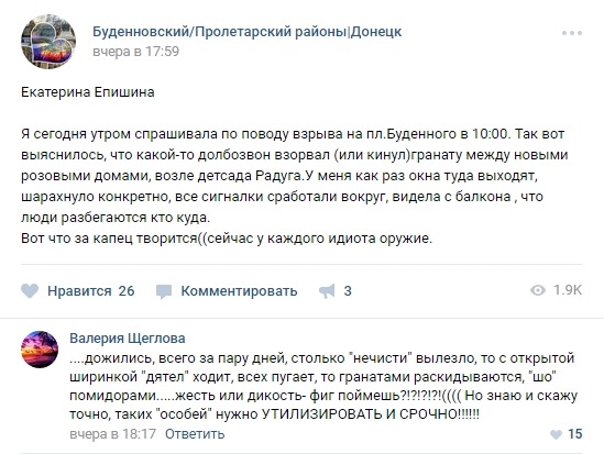 Жители оккупированного Донецка сообщают, что вчера, 21 марта, в Будденовском районе города, возле детского сада Радуга" взорвалась граната.