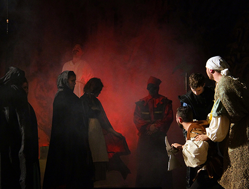 Григорий Горин - любимый драматург как артистов, так и главного режиссера театра "Время" Бориса Туменко. В репертуаре театра уже есть два спектакля по его произведениям: "Чума на оба ваши дома" и "Забыть Герострата". Теперь на сцене ожила пьеса Горина "Страсти по Тилю". Главный герой спектакля Тиль Уленшпигель (его сыграл Анатолий Герасименко) - плут, шутник и балагур - народный герой средневековых нидерландских и немецких легенд, сродни Ходже Насреддину. Он воплощает собой вольный и независимый дух народа. Но вот чем эта пьеса будет актуальна во все времена, так это вот таким посылом, выраженным в высказывании отца Тиля, угольщика Клааса: "Время подлым не бывает, только - люди!" Жить по совести, по вечным человеческим законам необходимо всегда и везде, вопреки политическим и религиозным нормам, царящим в государстве, - вот концентрированный смысл спектакля.
