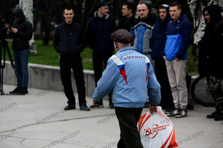 Пока военные маршировали под аккомпанемент оркестра, навстречу к ним выбежал пожилой мужчина в спортивной куртке с триколором и огромной надписью на спине «RUSSIA». Мужчина встал сбоку и выдвинул вперед пакет с надписью «Коммунистическая партия Украины». Он постоял так все время пока маршировала колонна, а потом так же тихо и спокойно ушел.