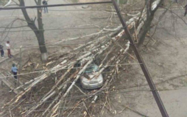 Сегодня, 28 марта, в Энергодаре Запорожской области сильный ветер снес тополь прямо на легковую машину.