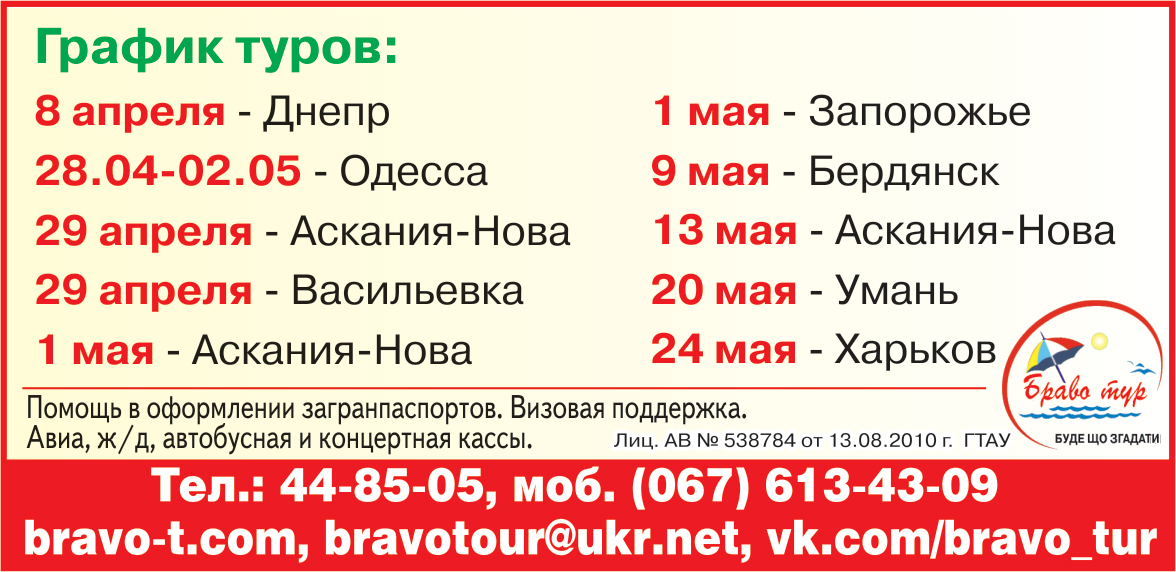 В однодневном туре вас доставят в «Асканию-Нова», вы с удовольствием пройдете познавательную экскурсию по заповеднику, насладитесь прекрасными видами дикой природы, повстречаете редких животных, сфотографируетесь на фоне удивительных растений. В двухдневный тур можно отправиться с вашими иногородними гостями или родственниками, он следует по маршруту: Мелитополь - Мирное - Геническ - (Арабатская Стрелка) - Аскания-Нова - Новоалексеевка и включает посещение Каменной Могилы, купание в термальных источниках с. Счастливцево, пребывание на море, экскурсию в «Асканию-Нову» др. Однодневный тур в автобусе на 18 мест стоит 295 грн. для взрослых и 285 грн. - для детей. Посадочные места в 30-местном автобусе дешевле: 240 грн. - взрослый билет и 220 грн. - детский. Стоимость 2-дневного тура для гостей Мелитополя: 758 грн. - взрослый, 735 грн. - школьники (автобус на 30 мест).