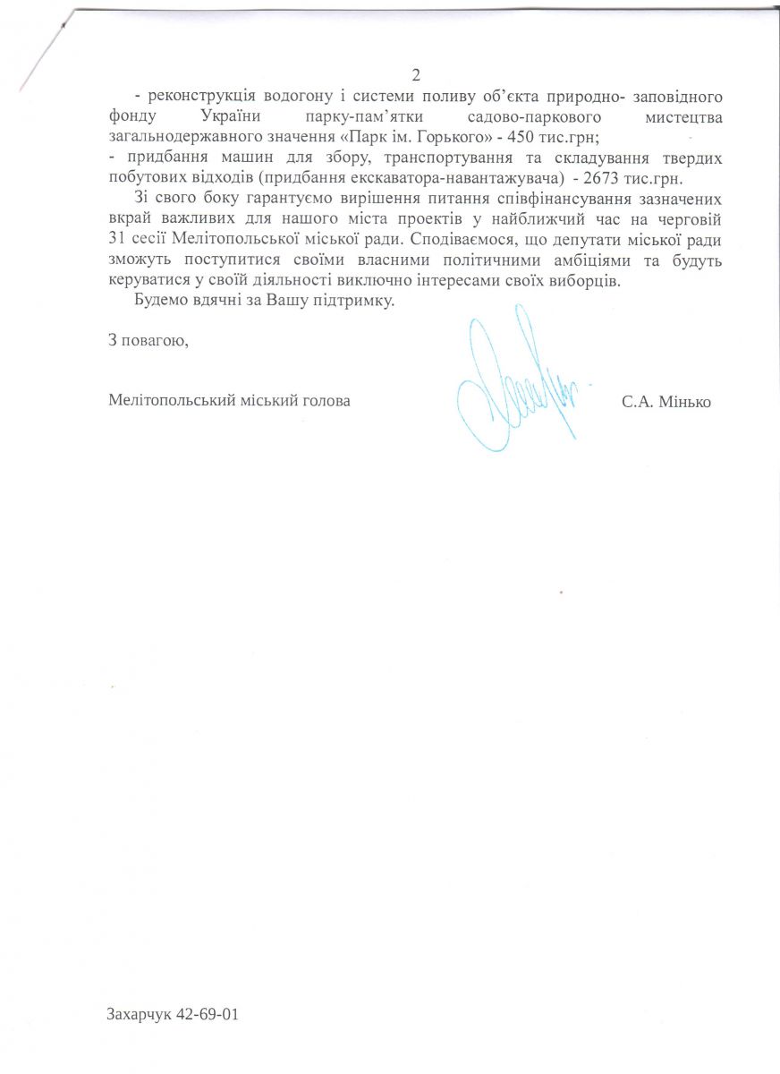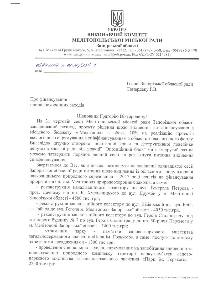"Внаслідок штучно створеної політичної кризи та деструктивної поведінки депутатів міської ради від фракції "Опозиційний блок" ми вже другий раз не можемо затвердити порядок денний сесії та розглянути питання виділення співфінансування. Звертаємося до Вас, як виняток розглянути на засіданні сесії питання щодо виділення із обласного фонду охорони навколишнього середовища в 2017 році коштів на фінансування пріоритетних для Мелітополя природоохоронних заходів.