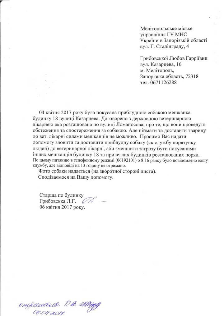 "Від укусів собак страждають мешканці Мелітополя. Люди постійно звертаються з заявами, скаргами на укуси собак до лікарів, до виконкому, до національної поліції. Обіцяних притулків в нашому місті немає. Дещо зроблено руками волонтерів, це чудово, але там тільки шість будок в яких можливо передержати 6 собачок. Вакцинацію тварин (собачок, котів) ніхто не проводить. Звичайні люди, маленькі діточки, які щодня ходять вулицями повз цілі зграї безхатніх псів, ризикують життям. На вулиці Казарцева, будинок 18 (п’ятиповерховий) приблудилася така собачка, яка усю ніч лає, в ранці проводжає кожного, хто виходе з під`їзду, та вже укусила одну людину. Як і полагається, дівчина після укуса, негайно звернулася до лікаря. Зробили щеплення від стовбняка. На жаль, вакцини від сказу, не має!!! В лікарні запропонували 10 днів спостерігати за поведінкою цієї собаки. А як це зробити? Якщо протягом 10 днів у собаки не з’являться ознаки сказу, то щеплення можна і не робити. А якщо будуть ознаки сказу? Домовилися з державною ветеринарною лікарнею про те, що вони можуть поспостерігати за собакою, але служби, яка може доставити цю собаку до лікарні – ТЕЖ НЕМАЄ! Звернення до виконкому ні допомогли. Чекаємо на допомогу від служби порятунку нашого міста та сподіваємося, що питання буде вирішено", - пишет Л. Грибовская.